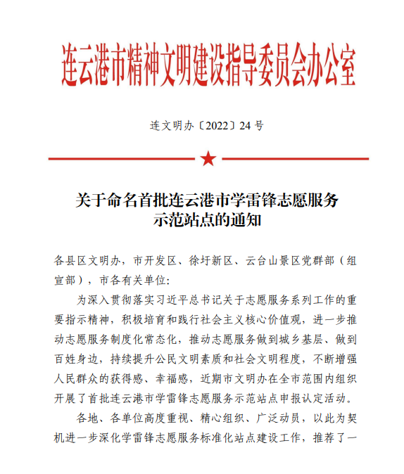 針對此次命名,連云港市文明辦強調(diào)各站點要充分發(fā)揮學雷鋒志愿服務示范站點的示范引領作用,在推動志愿服務制度化、規(guī)范化、常態(tài)化上下功夫,大力培育志愿服務文化,不斷提升公民道德素質(zhì)和社會文化程度,為推動新時代的“后發(fā)先至”、建設人民期待的現(xiàn)代化新港城凝聚強大精神力量。