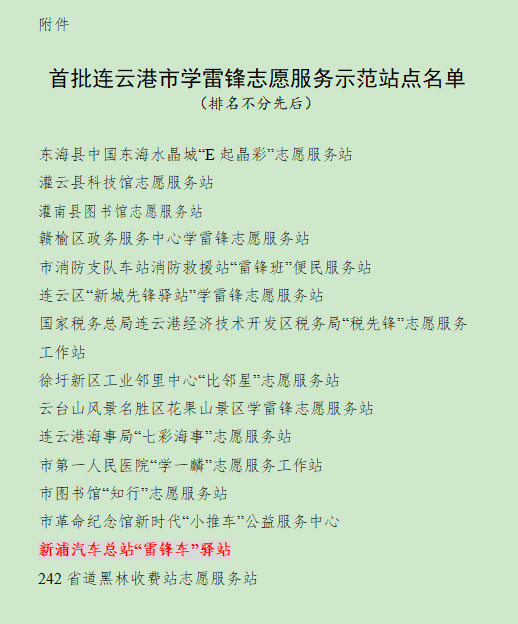 近日,連云港市文明辦命名了首批連云港市學雷鋒志愿服務示范站點15個,覆蓋眾多行業(yè)及領域。其中,連汽新浦汽車總站“雷鋒車”驛站成功入選。