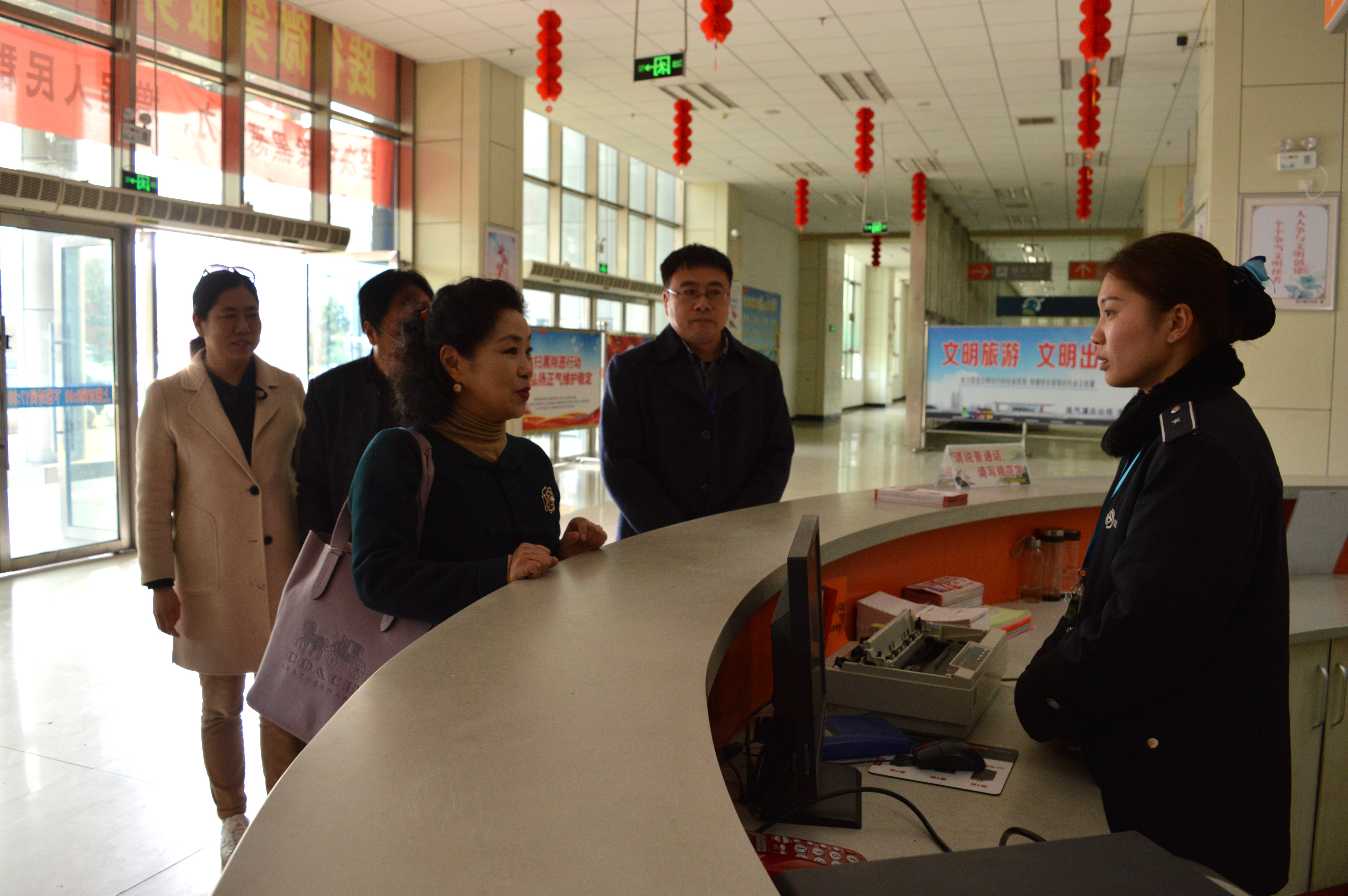檢查中,督查組認(rèn)真聽取了客運(yùn)站語言文字工作及普通話推廣情況的匯報(bào),并通過現(xiàn)場(chǎng)提問、實(shí)地驗(yàn)證等形式對(duì)客運(yùn)站的語言文字規(guī)范化工作進(jìn)行了全方位考察和評(píng)估。督查組還實(shí)地查看了客運(yùn)站場(chǎng)、候車大廳、售票大廳、安檢臺(tái)的指示牌、宣傳欄、電子屏幕標(biāo)語用字用語是否規(guī)范,并對(duì)檢票口工作人員的服務(wù)用語、用字規(guī)范進(jìn)行了檢查,同時(shí)詢問旅客在服務(wù)中車站工作人員是否使用普通話、文明用語。
