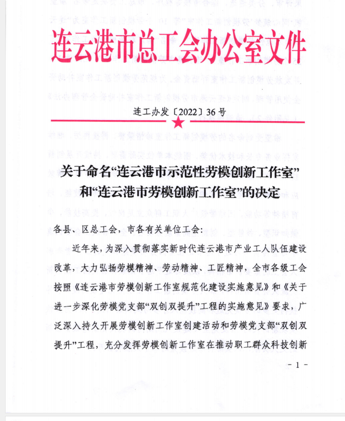 由于勞模何錫忠在汽車噴涂行業(yè)中取得的優(yōu)異成績,2022年6月份,經(jīng)基層工會申報、成果評審等程序,“何錫忠勞模創(chuàng)新工作室”被連云港市總工會命名為“連云港市示范性勞模創(chuàng)新工作室”。