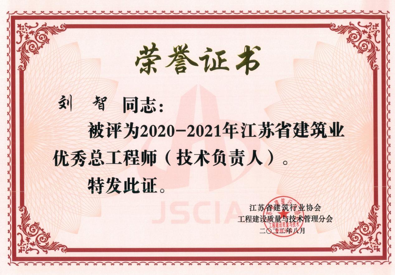 近日,由江蘇省建筑行業(yè)協(xié)會(huì)《關(guān)于發(fā)布2020-2021年江蘇省建筑業(yè)優(yōu)秀總工程師(技術(shù)負(fù)責(zé)人)評(píng)價(jià)結(jié)果的通知》(蘇建質(zhì)協(xié)[2022]11號(hào))獲悉,江蘇海建公司總工程師劉智同志被評(píng)為2020-2021年度江蘇省建筑業(yè)優(yōu)秀總工程師。據(jù)悉,連云港市共有五人獲得該榮譽(yù)。