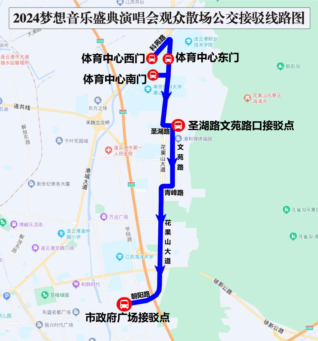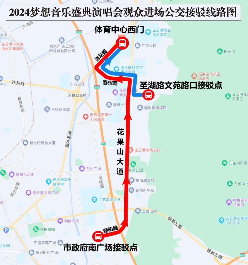 觀眾進(jìn)場(chǎng):可在市政府廣場(chǎng)臨時(shí)接駁點(diǎn)(文化藝術(shù)中心)、圣湖路文苑路口臨時(shí)接駁點(diǎn)(716研究所對(duì)面)乘坐演唱會(huì)免費(fèi)接駁公交至體育中心西門(mén)下車(chē),接駁線路圖: