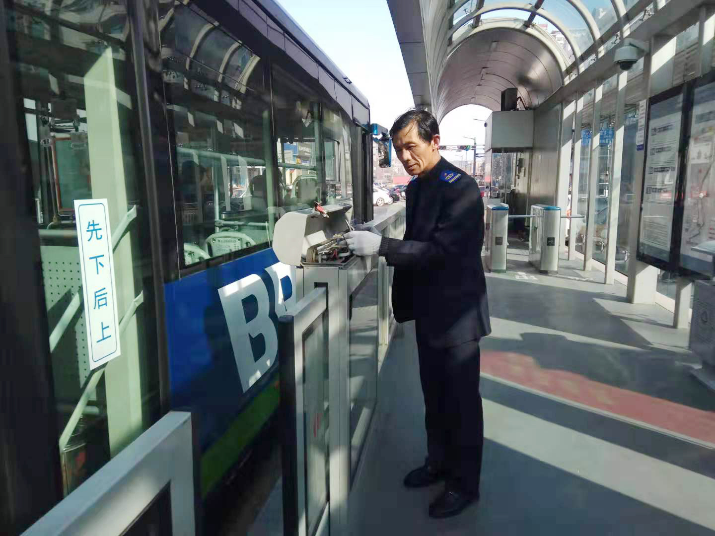 六年多前BRT建成開(kāi)通時(shí),尹德軍師傅和大家一樣,對(duì)BRT站臺(tái)的一切都是從零開(kāi)始,但是現(xiàn)在,尹師傅卻是整個(gè)公司里最熟悉BRT站臺(tái)設(shè)備的人,也是站務(wù)員最熟悉的親人。站臺(tái)安全門(mén)打不開(kāi),站務(wù)員打電話找尹師傅;設(shè)備間排風(fēng)扇不工作了,站務(wù)員找尹師傅;售票房的燈不亮、桌子、椅子壞了,站務(wù)員都找尹師傅。站務(wù)員的工作時(shí)間是早上五點(diǎn)半到晚上九點(diǎn),站務(wù)員們有早、晚班的區(qū)別,可是站臺(tái)維修員尹德軍師傅是沒(méi)有上下午班之分的,不管站務(wù)員是早上五點(diǎn)多打電話找他,還是晚上八九點(diǎn)時(shí)找他,接到電話的尹師傅總是第一時(shí)間內(nèi)趕到站臺(tái),幫助站務(wù)員解決難題。在BRT成立的七年的時(shí)間里,尹德軍師傅他自己也不知道有多少個(gè)清晨在睡夢(mèng)中被電話鈴聲叫醒、多少個(gè)晚上在一家團(tuán)聚吃晚餐的時(shí)候放下碗筷,趕去站臺(tái)搶修設(shè)備。