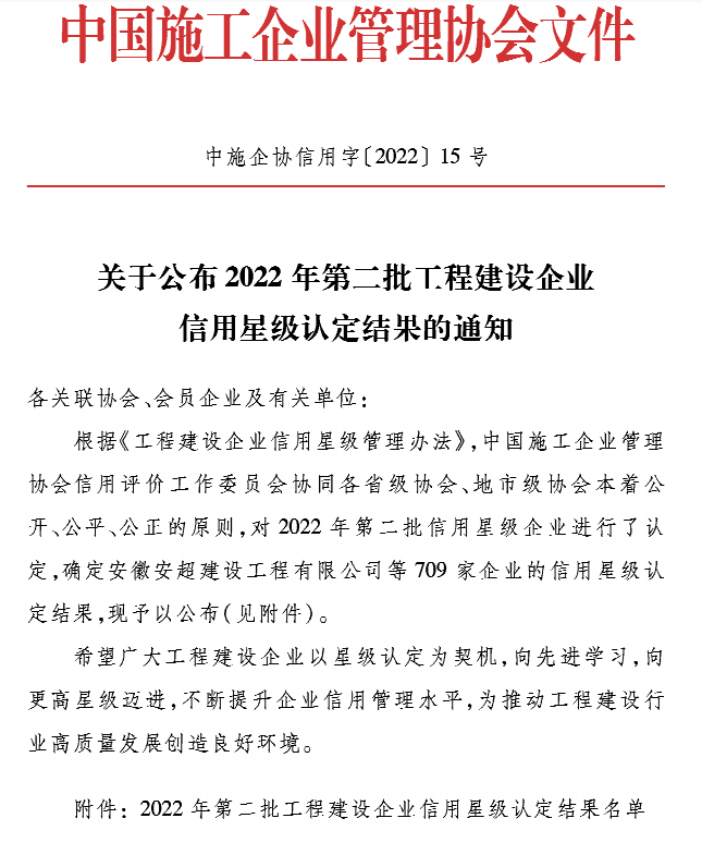 2022年3月下旬,中國施工企業(yè)管理協(xié)會下發(fā)評審通知,公司第一時間落實相關材料整理,5月完成上報。此次評審中,參評企業(yè)709家,海建公司較之2021年,企業(yè)信用星級再增1星,成績名列前茅。