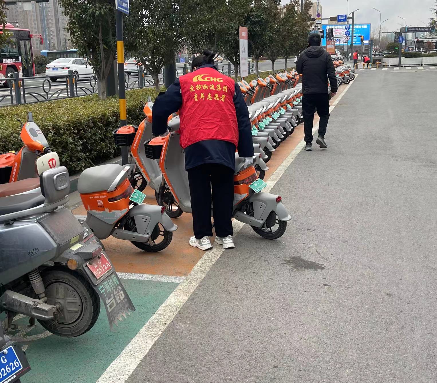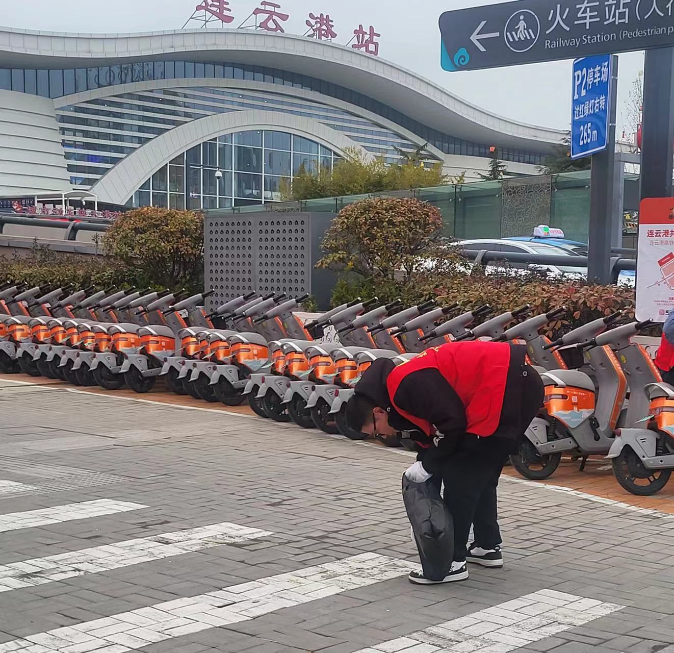 志愿者們身著紅色馬甲,帶著手套、垃圾袋等工具,仔細清除高鐵站附近人行道上暴露的煙頭、白色污染等垃圾,一路走過去,確保不留死角;將亂停亂放的共享單車進行集中整理,移至劃線的定點停放區(qū)域,按統(tǒng)一方向擺放整齊,避免共享單車堵塞道路、阻礙公眾通行等問題的發(fā)生。