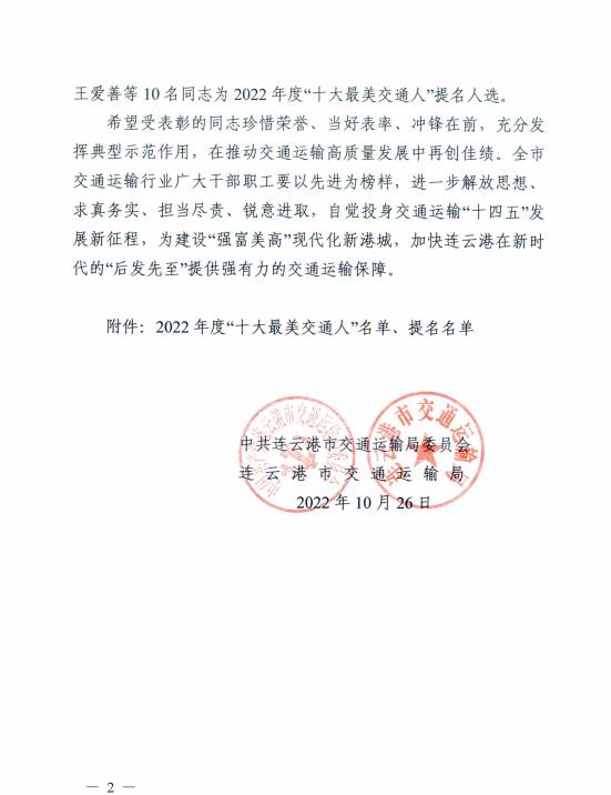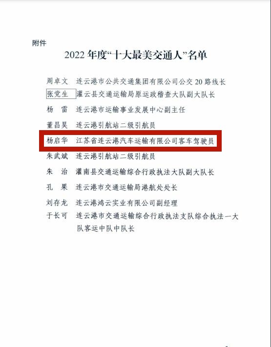 為深入貫徹落實(shí)中央和省市培育踐行社會(huì)主義核心價(jià)值觀系列部署要求,擦亮“美·德照亮港城”品牌,弘揚(yáng)傳遞社會(huì)正能量,培育和弘揚(yáng)新時(shí)代交通精神,2022年7月至9月,市交通運(yùn)輸局組織開(kāi)展了2022年度“十大最美交通人”評(píng)選活動(dòng)。經(jīng)過(guò)宣傳發(fā)動(dòng)、推薦申報(bào)、初評(píng)篩選、網(wǎng)絡(luò)投票、專家評(píng)審等環(huán)節(jié),汽車公司客車駕駛員楊啟華勇于擔(dān)當(dāng)、無(wú)私奉獻(xiàn),為推動(dòng)交通運(yùn)輸高質(zhì)量發(fā)展做出了積極貢獻(xiàn),榮獲連云港市2022年度“十大最美交通人”。