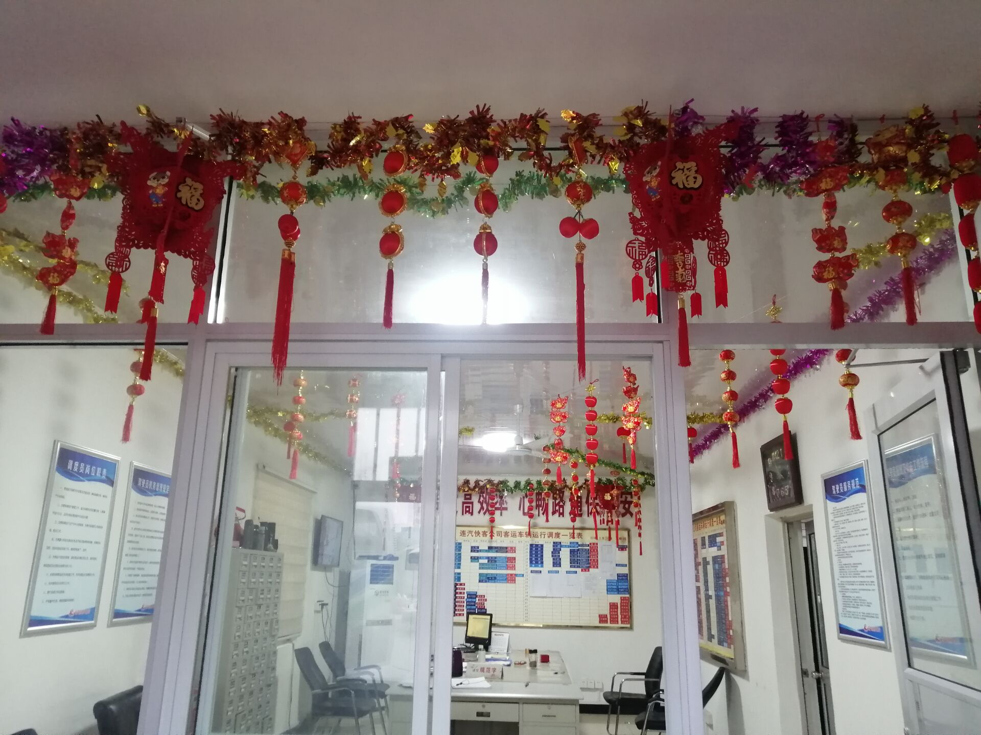 春節(jié)將至,為營造深厚的新春氛圍,以嶄新的面貌喜迎新的一年,快客公司于1月22日上午在運調(diào)中心及駕駛員休息室大門兩側(cè)掛起了國旗,火紅的大燈籠也高高掛起。在運調(diào)中心辦公區(qū)域懸掛起一個個火紅的小燈籠和“福”字,在辦公樓區(qū)域貼起了“喜迎八方來客平安一路、滿載五湖春意幸福一生”,橫批“賀新禧”的對聯(lián),積極營造溫馨祥和“家”的氛圍,讓整個運調(diào)中心和辦公區(qū)域年味十足,通過這些喜慶的形式來迎接新春的到來。