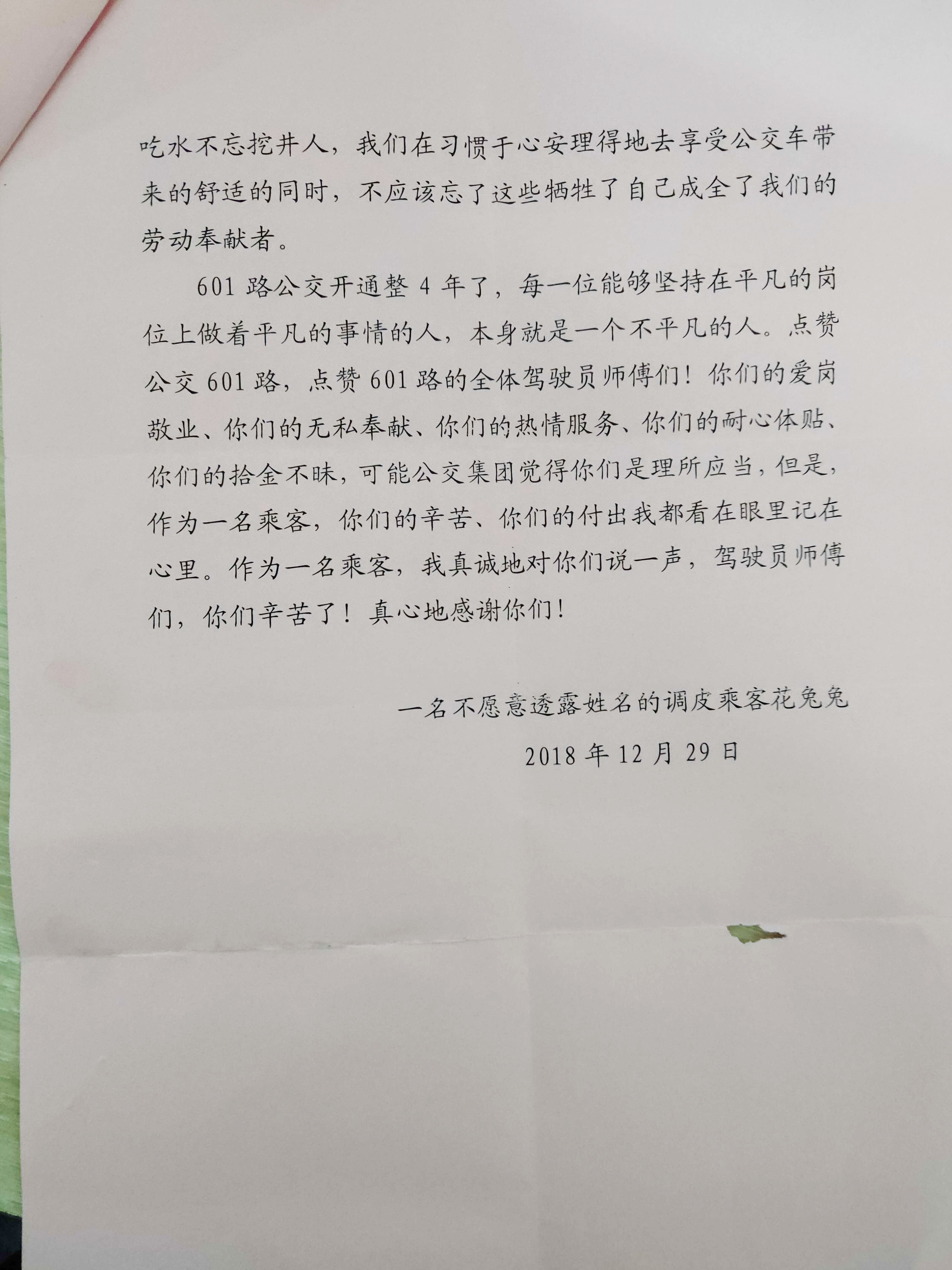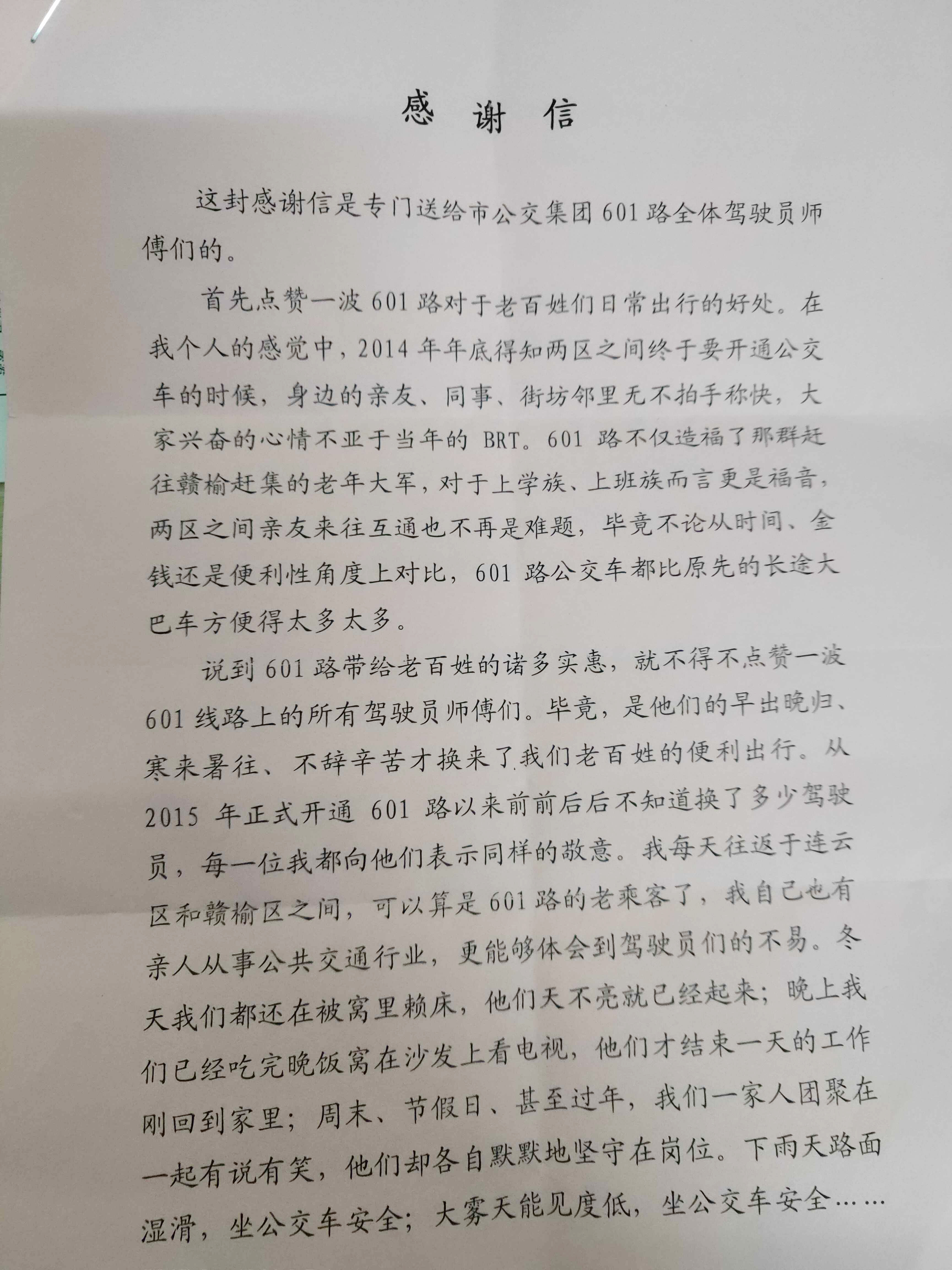 感謝信中提到:601路帶給老百姓的諸多實惠當(dāng)中,作者最要感謝的就是601全線上的所有駕駛員師傅們。是他們的早出晚歸、寒來暑往、不辭辛苦才換來了老百姓的便利出行。從2015年正式開通601路以來,每一位駕駛員都是兢兢業(yè)業(yè)地奮斗在工作崗位上,披星而出,戴月而歸,甚至于節(jié)假日都堅守在崗位上!乘客們再享受公交車帶來的便利、舒適的同時,打從心底里感激這些任勞任怨的駕駛員們!