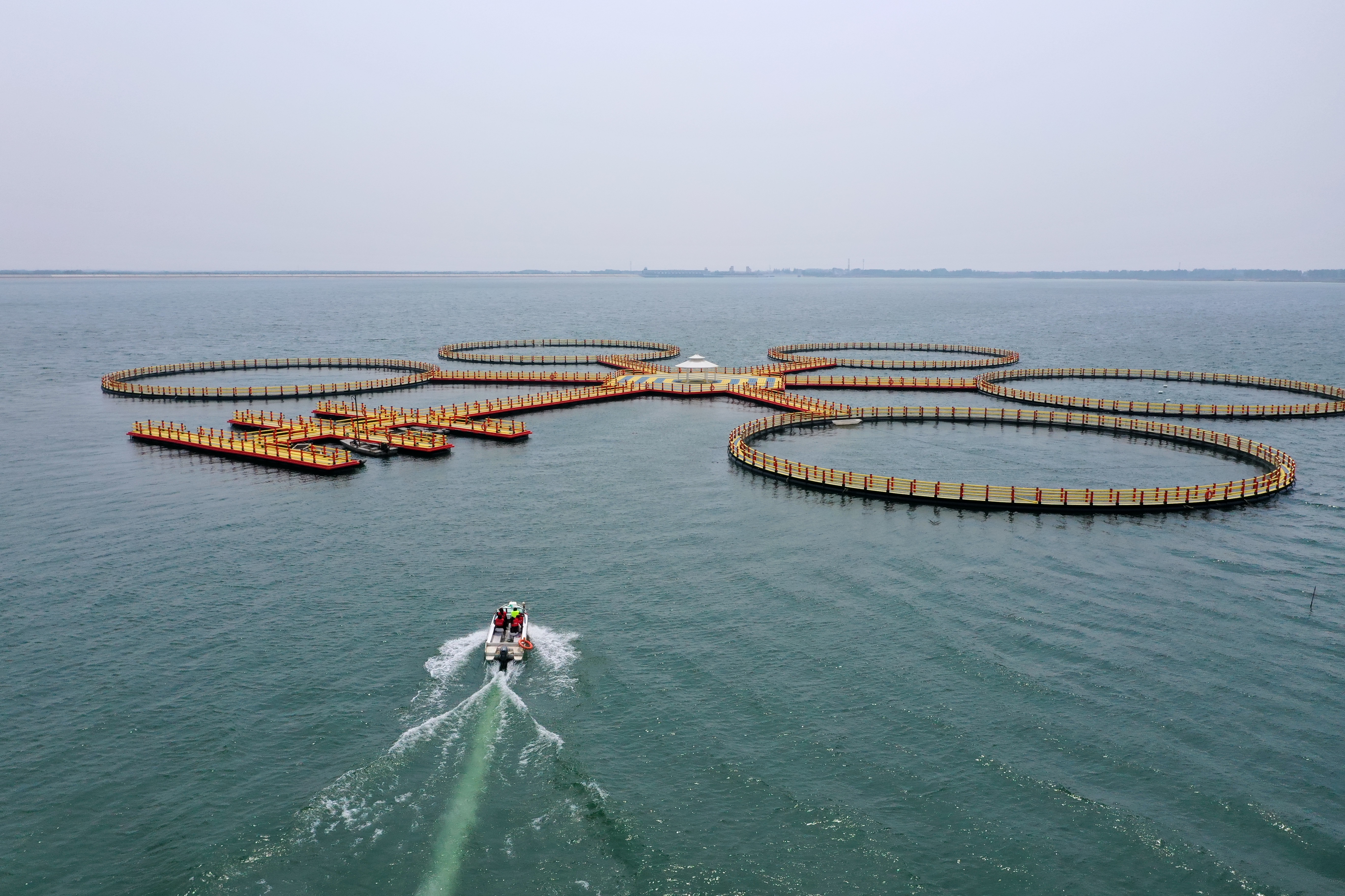在大水面上,約20畝的水上觀景平臺和五環(huán)漁島組成水上休閑觀光平臺。漫漫水面、微風拂過、天闊景廣、暗涌浮動,既有“所謂伊人,在水一方”的唯美畫面,又有“日出水上,大美江山”的壯闊情懷,是游客的向往之處。